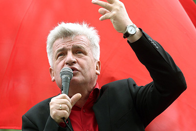 Obchody 1 Maja w Warszawie. Jeden z uczestników marszu – Piotr Ikonowicz z Kancelarii Sprawiedliwoœci Spo³ecznej przed KPRM. Anarchistyczny marsz przeciw kapitalizmowi i wyzyskowi przeszed³ od ronda de Gaulle’a pod kancelariê premiera, 1 bm. Organizator marszu – osoba prywatna przewidywa³a udzia³ w demonstracji ok. 200 osób. (tg/cat)